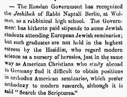 Here's a little blurb about some recognition of the yeshiva of Volozhin by the Russian government. Apparently this recognition meant that some students could receive stipends from the government. 1881.