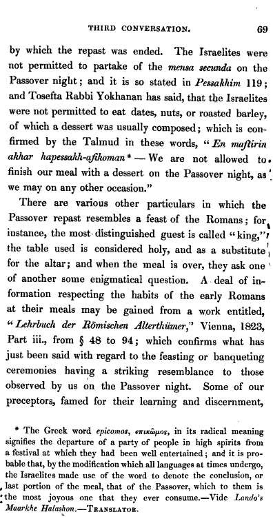 It should not be surprising that the awareness of many similarities between the forms of the Passover seder and the Symposium seder can be found in Christian literature for centuries. After all, the seder plays an important role in the New Testament and the classical literature where it's form is described was on the reading lists of those scholars. Note: similarity means . . . similarity. Naturally the question is not as simple and simple-minded as either Hirsch or Reinman presents it. But I'm more interested in the afikomen (see Balashon).